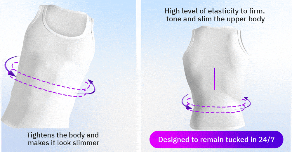 Cotton compression undershirt that features a high level of elasticity to firm, tone and slim the upper body. Its tapered construction is designed to remain tucked in all day long! Our patented technology tightens the body and makes it look slimmer.
